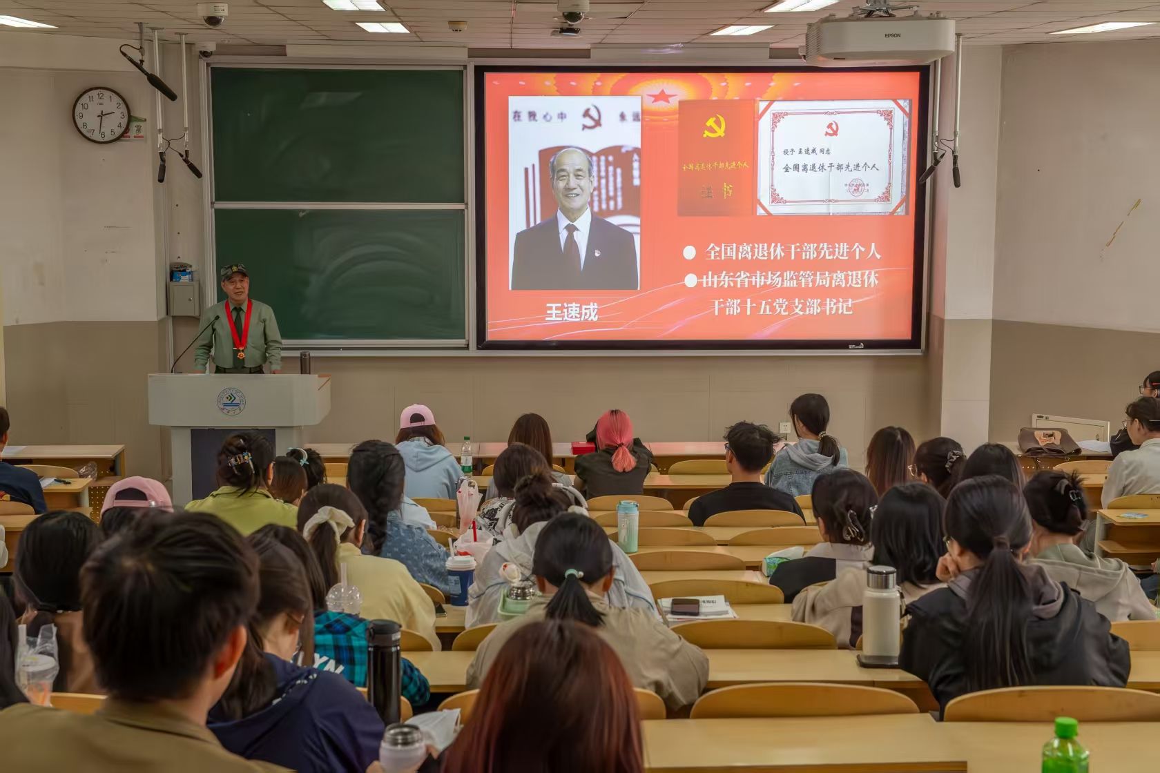 活动特别邀请退伍归来的研究生学生宋键作为本次活动的主持人,他以一段热情洋溢的开场词拉开了本次活动的序幕。当主持人介绍到场嘉宾王速成老师时,现场气氛被迅速点燃。王老师作为退役老兵,从部队转业后坚守军人本色,荣获“省委,省政府一等功”等诸多荣誉。身为山东省市场监督管理局离退休干部志愿者团团长,退休后仍奉献不止。宣讲中,王老师凭借深耕红色宣讲领域的深厚积累,以鲜活故事讲述革命先辈奋斗历程,用亲身经历诠释共产党人初心使命。他对红色文化理解深刻,每句话都饱含深情。通过这场演讲,聆听的同学们仿佛穿越时空,触摸到历史温度,真切感受红色精神磅礴力量。