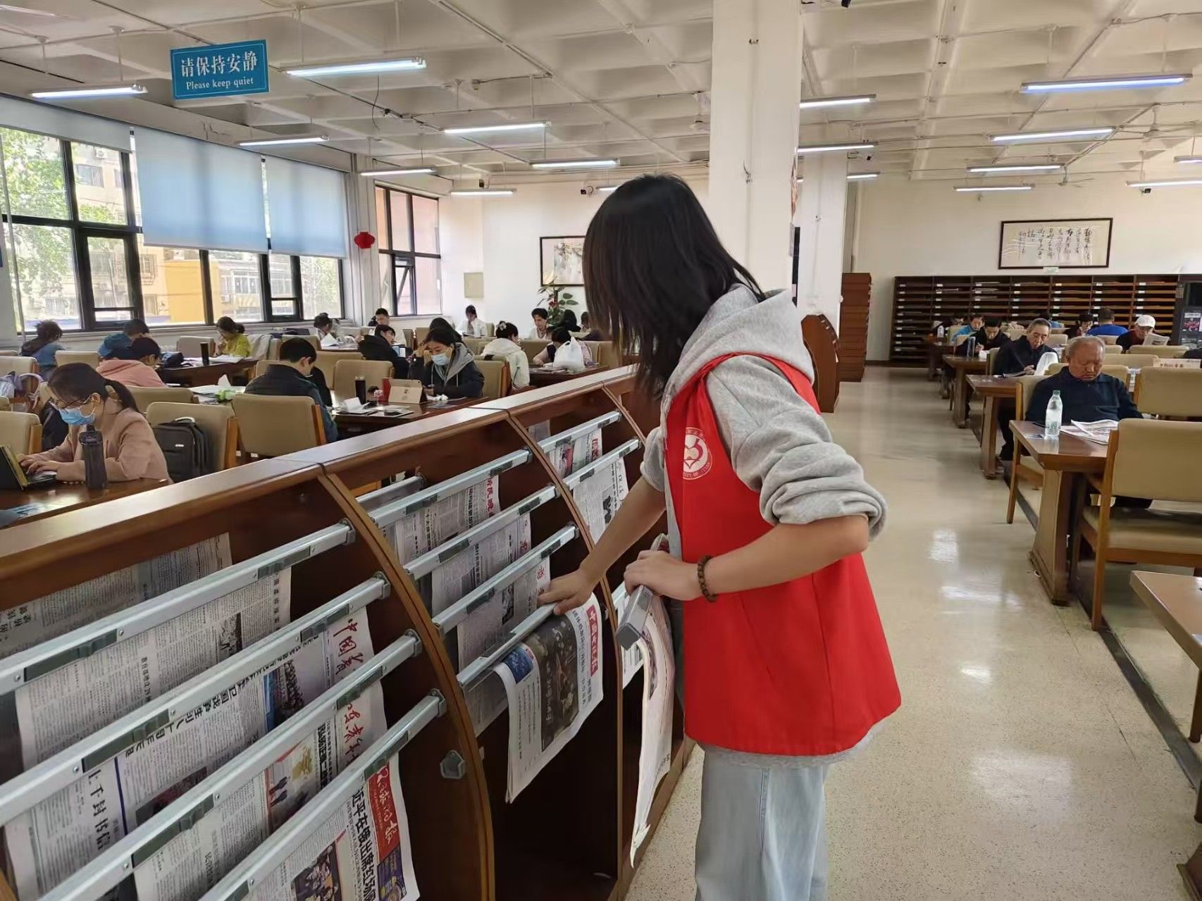 活动伊始,志愿者们明确工作内容,到达各自的工作地点,进行场地布置和卫生打扫等工作,为读者的到来做准备。活动规程中,志愿者们协助工作人员维护阅读环境,并进行图书下架、整理书架等工作,将未上架的书本一一对应放到书架上,方便书房中的读者阅读学习。此次活动不仅优化了图书馆的阅读环境与书籍管理秩序,更在志愿者与读者之间搭建起一座文化交流的桥梁,让知识的传递更顺畅,让阅读的氛围愈发浓厚,以实际行动诠释了志愿精神与阅读推广的深度融合。
