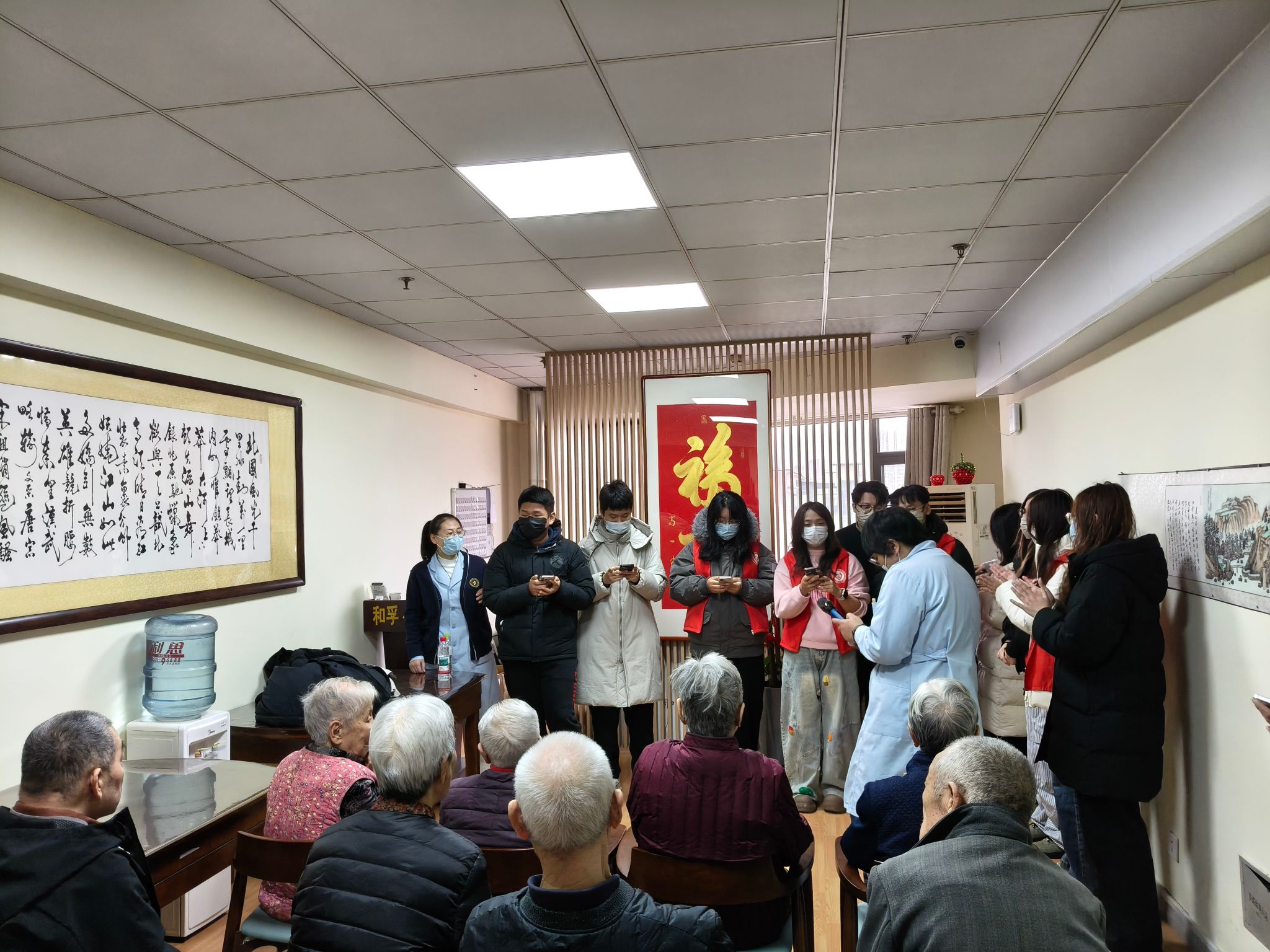 活动以“情感陪伴+实践服务”为核心展开,志愿者们与老人围坐畅谈,静心聆听老人讲述抗美援朝的峥嵘往事,在轻声询问与专注倾听中,表达对前辈奋斗精神的敬意。文艺表演环节,歌曲演唱、舞蹈展示轮番登场,婉转的旋律与鲜活的舞姿让公寓内洋溢着欢乐氛围。此外,志愿者化身“服务者”,主动承担起公寓的日常服务工作,他们手持抹布、扫帚,细致清理房间角落的灰尘,认真擦拭桌椅家具的纹路,对腿脚不便的老人则全程搀扶陪同,从活动场地到寝室楼道,处处可见志愿者忙碌的身影,专业又贴心的服务收获了老人们的连连称赞。活动最后,志愿者与老人们携手站定,共同唱响《没有共产党就没有新中国》,激昂的歌声跨越年龄界限,红色情怀与志愿温情在旋律中交融,也让这场敬老服务更添精神厚度。