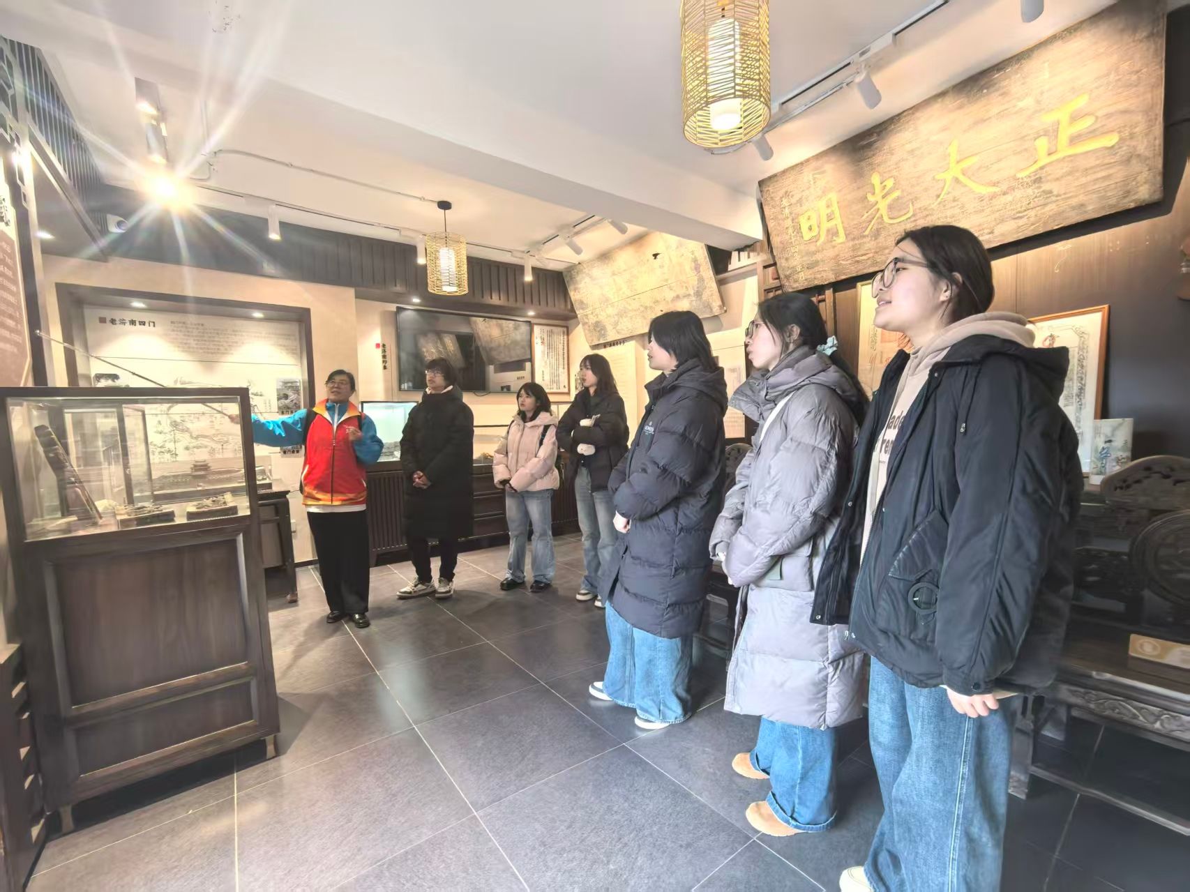 活动以“沉浸式研学+场景化讲解”为核心形式,志愿者们在指导老师引领下沿大明湖沿线展开文化探访。南门牌坊处,老师结合“天下第一泉”水系脉络,系统阐释李清照、辛弃疾等济南名士的生平事迹与文化贡献,清晰梳理名士文化与地域水系的共生关联;在百花洲畔,明代城墙摹绘图成为历史载体,老师围绕济南府城池格局演变、护城河水利规划智慧展开深度解读,志愿者通过近距离观察摹绘细节,深化对古城建筑规制的认知;大宾第老院落内,丁宝桢治水惩贪的史实讲解结合济南方言互动环节,让历史场景鲜活呈现。活动特别设置革命诗句齐诵环节,将地域文化探寻与红色精神传承相结合,让传统文化学习兼具历史厚度与时代内涵,志愿者们在实地探访中完成了从“认知”到“感悟”的深化。