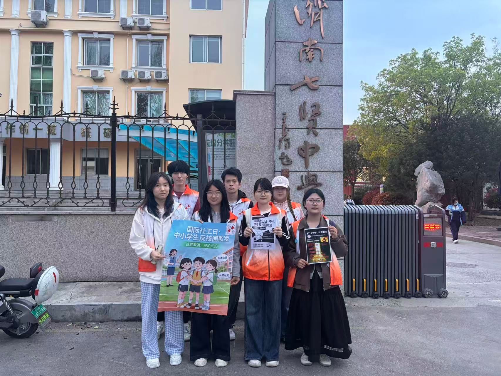 社会工作专业2025级本科生在七贤中学门口开展“童心守护,社工同行”国际社工日反校园欺凌主题宣传活动。本次活动在韩钰、范文清两位老师悉心指导下精心筹备,团队提前准备校内宣讲PPT,结合现场实际调整为校外宣传,以传单发放与非结构式访谈相结合的方式,向中学生及家长普及社会工作专业知识,呼吁共同抵制校园欺凌。