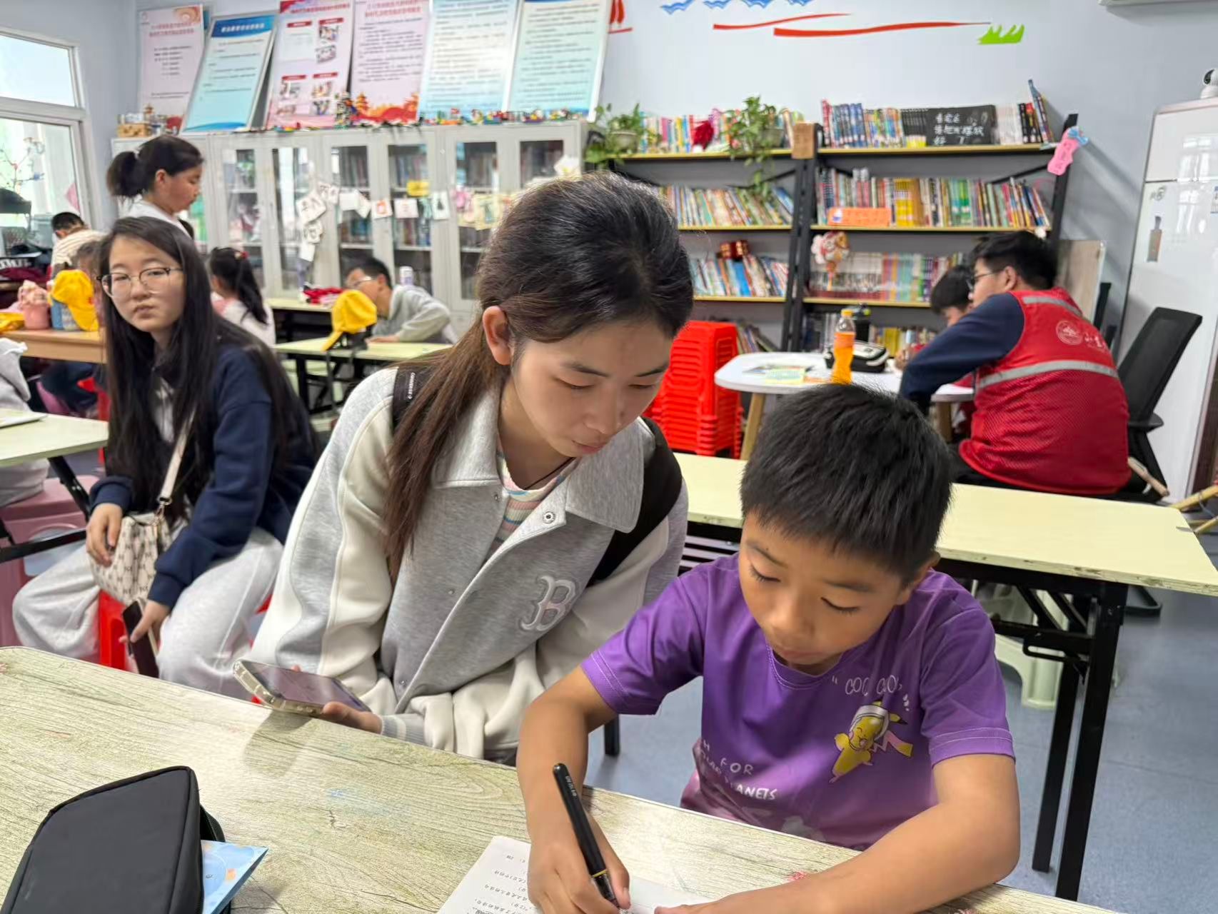 活动伊始,志愿者们便以饱满的热情迅速与孩子们打成一片,课业辅导环节也随之有序展开。志愿者们不仅耐心解答学业中的难题,更注重培养孩子们的学习兴趣。面对复杂的数学题,志愿者们会用生动的故事和形象的比喻来拆解;在语文阅读中,则通过角色扮演和情景再现,让文字变得鲜活起来。除了功课,志愿者们还精心准备了手工制作、趣味绘画等拓展活动。在五彩斑斓的画笔下,孩子们的想象力自由驰骋;在精巧的手工制作中,孩子们的动手能力和创造力得到了充分锻炼。整个过程充满了欢声笑语,孩子们不仅收获了知识,更感受到了陪伴的温暖。