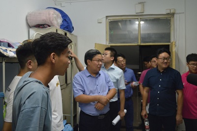 党委书记徐庆国、院长梁丽霞、正处级组织员国迎春、党委副书记于龙泉和辅导员、班主任老师一起来到新生宿舍,看望初入校园的新同学。
