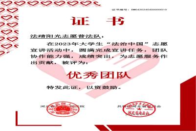 阳光先锋青年志愿者协会在“法治中国”志愿活动宣讲中,传播法律知识,了解国情民生,践行使命担当,圆满完成宣讲任务,成绩突出,在多个团队中脱颖而出,成功入选法治中国志愿宣讲优秀团队。