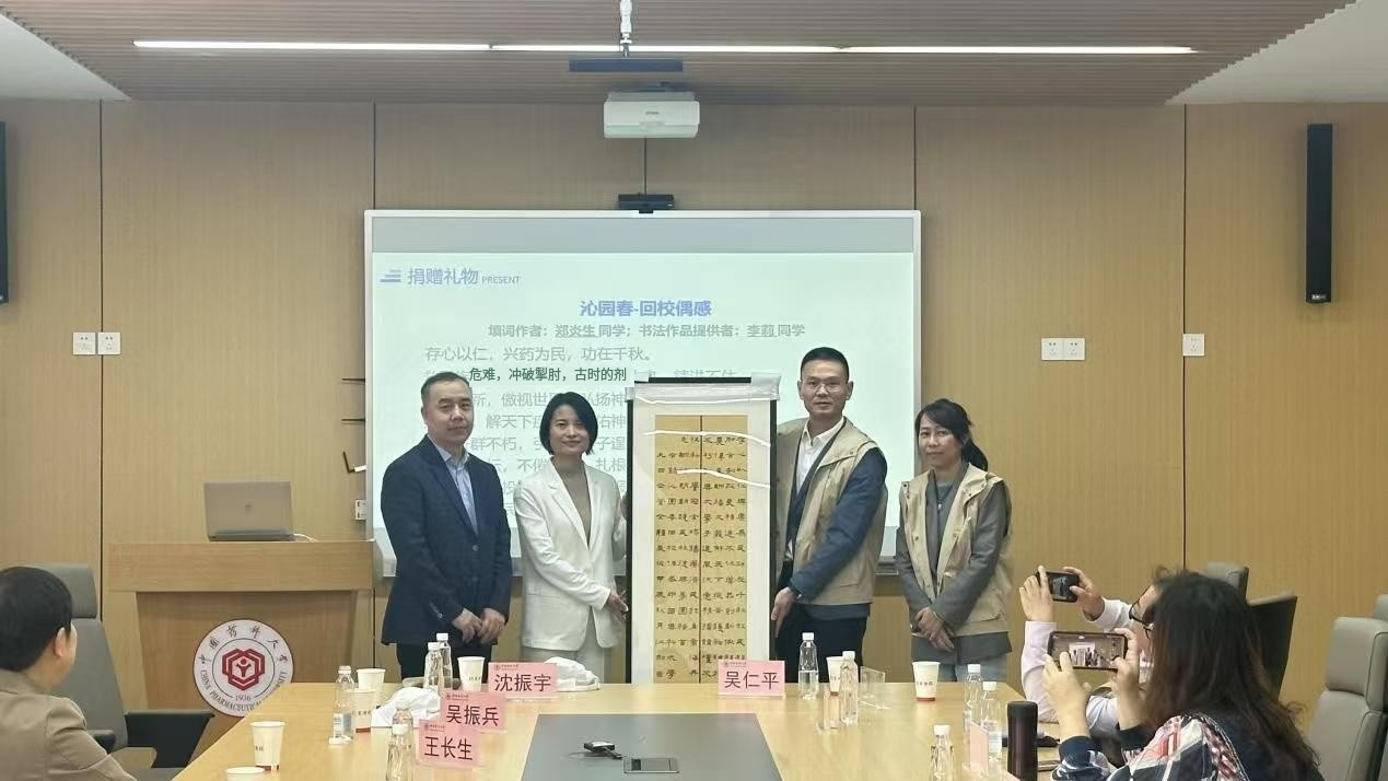 接下来,1994级医药企业管理专业的校友代表向国际医药商学院捐赠了诗词书法作品,表达了全体校友对母校和国际医药商学院深深的敬意和衷心的祝福。校友们表示将继续践行“精业济群”的校训精神,为医药事业、为社会发展增光添彩。