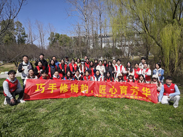 3月18日,国际医药商学院于江宁校区经管文楼南侧梅花林组织“巧手修梅韵,匠心育芳华”劳动教育主题实践活动。国际医药商学院党委书记丁素军、辅导员代表及药事管理专业本科生党支部成员共同参加。