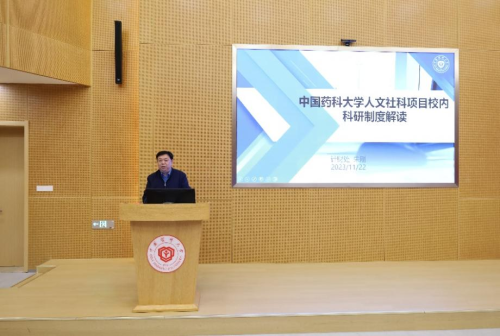 科研管理科科长朱刚随后作《中国药科大学人文社科项目校内相关制度解读》的讲座,他从科研项目经费编制、分配流程、预算调整、结余资金管理等方面做了详细解读,并对科研经费支出要点进行了逐项解读,针对一些经费开支使用的常见问题作了答疑。